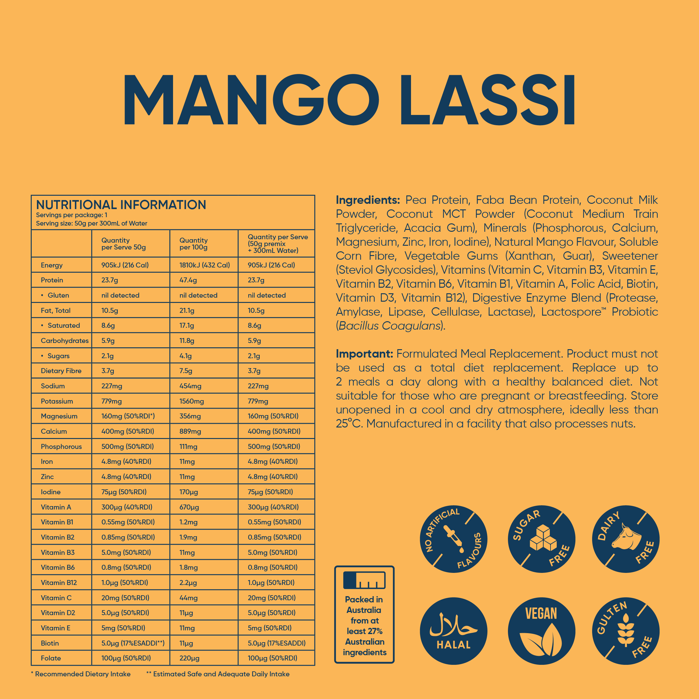 Pea Protein, Faba Bean Protein, Coconut Milk Powder, Coconut MCT Powder (Coconut Medium Chain Triglyceride, Acacia Gum), Minerals (Phosphorous, Calcium, Magnesium, Zinc, Iron, Iodine), Natural Mango Flavour, Soluble Corn Fibre, Vegetable Gums (Xanthan, Guar), Sweetener (Steviol Glycosides), Vitamins (Vitamin C, Vitamin B3, Vitamin E, Vitamin B2, Vitamin B6, Vitamin B1, Vitamin A, Folic Acid, Biotin, Vitamin D3, Vitamin B12), Digestive Enzyme Blend (Protease, Amylase, Lipase, Cellulase, Lactase), Lactospore™ Probiotic (Bacillus Coagulans).